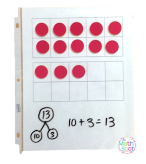 By building teen numbers on a ten frame and pairing that representation with a number bond and equation we are supporting students in developing number sense around teen numbers as it involves 3 of the 4 number relationships that students with strong number sense are able to rely on.