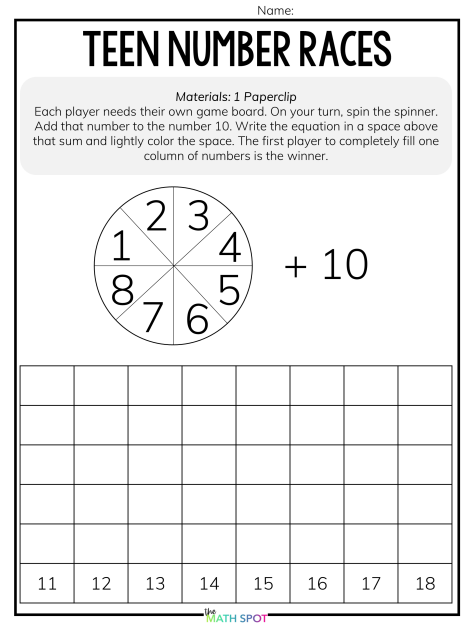 In a game like Teen Number Races, students practice their 10+ facts over and over. Instead of a generic board game paired with a pile of flashcards, this type of game gives students repeated opportunities to apply a strategy they already know.