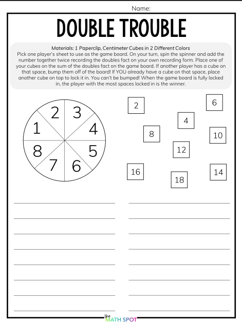Double Trouble is a spinner game that allows partners to compete while practicing doubles facts specifically. The structure of the game keeps the focus narrow, which is exactly what we want at this stage.